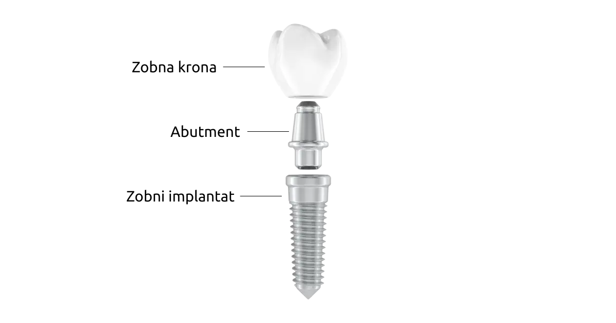 Zobni vsadek je umetna korenina zoba, izdelana iz titana – biokompatibilnega materiala, ki naravno zrašča s kostjo, zato ga telo ne prepozna kot tujek.